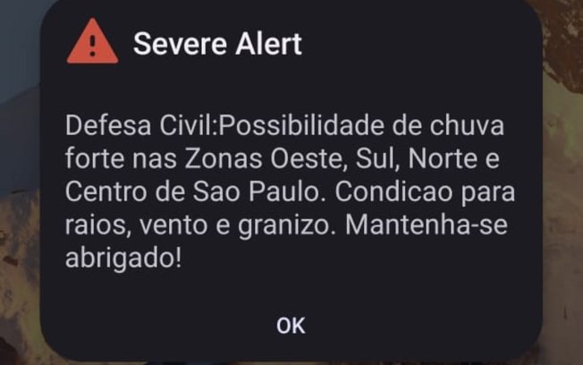 Na tarde desta sexta-feira (10), a Defesa Civil de São Paulo emitiu um alerta de chuvas fortes e queda de granizo severo para as regiões norte, sul e centro da capital. O aviso automático foi enviado para telefones da região. As chuvas vêm acompanhadas de ventos fortes, e há a possibilidade de descargas elétricas. Piracicaba também está em alerta.